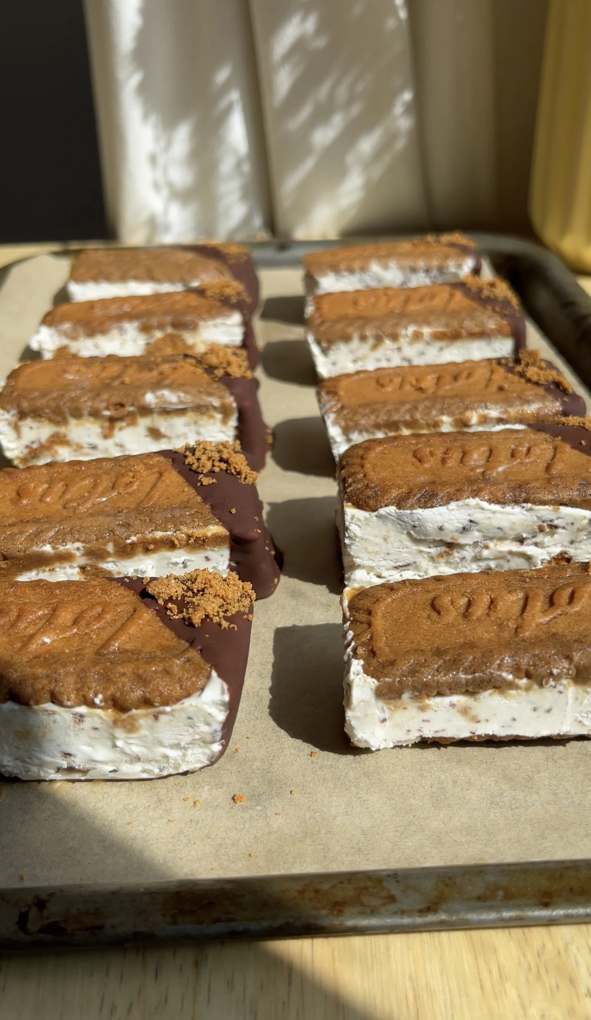 • Once frozen, melt the chocolate and coconut oil together. Slice the sandwiches and dunk the ends in the chocolate mixture, sprinkle some biscoff crumbs over the chocolate then place on a lined plate or baking tray and back in the freezer to freeze solidly before devouring immediately.