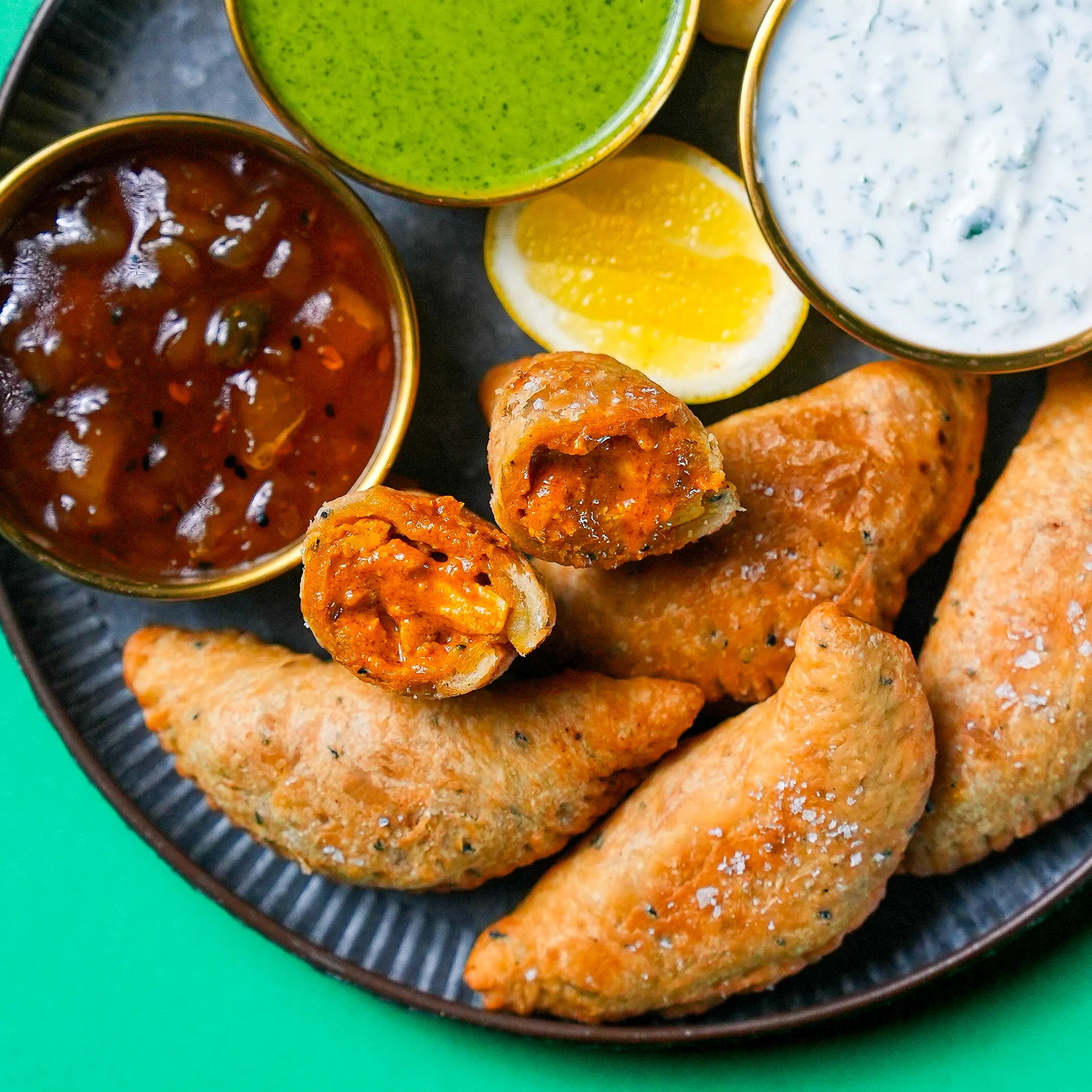 While these might just look like samosas in a different shape, I promise you they're not! The buttery, flaky empanada dough is made extra special with the addition of nigella seeds, filled with creamy butter chicken and fried to perfection. Served with a variety of dips so there's something for everyone.