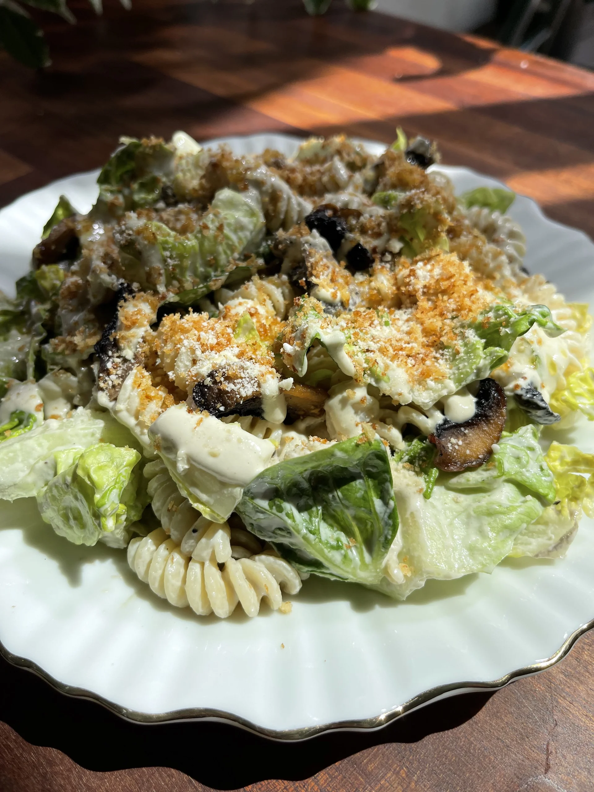 Add the cooked pasta, dressing, lettuce and roasted mushrooms (leaving a few to garnish) into a large mixing bowl and mix to coat in the dressing.