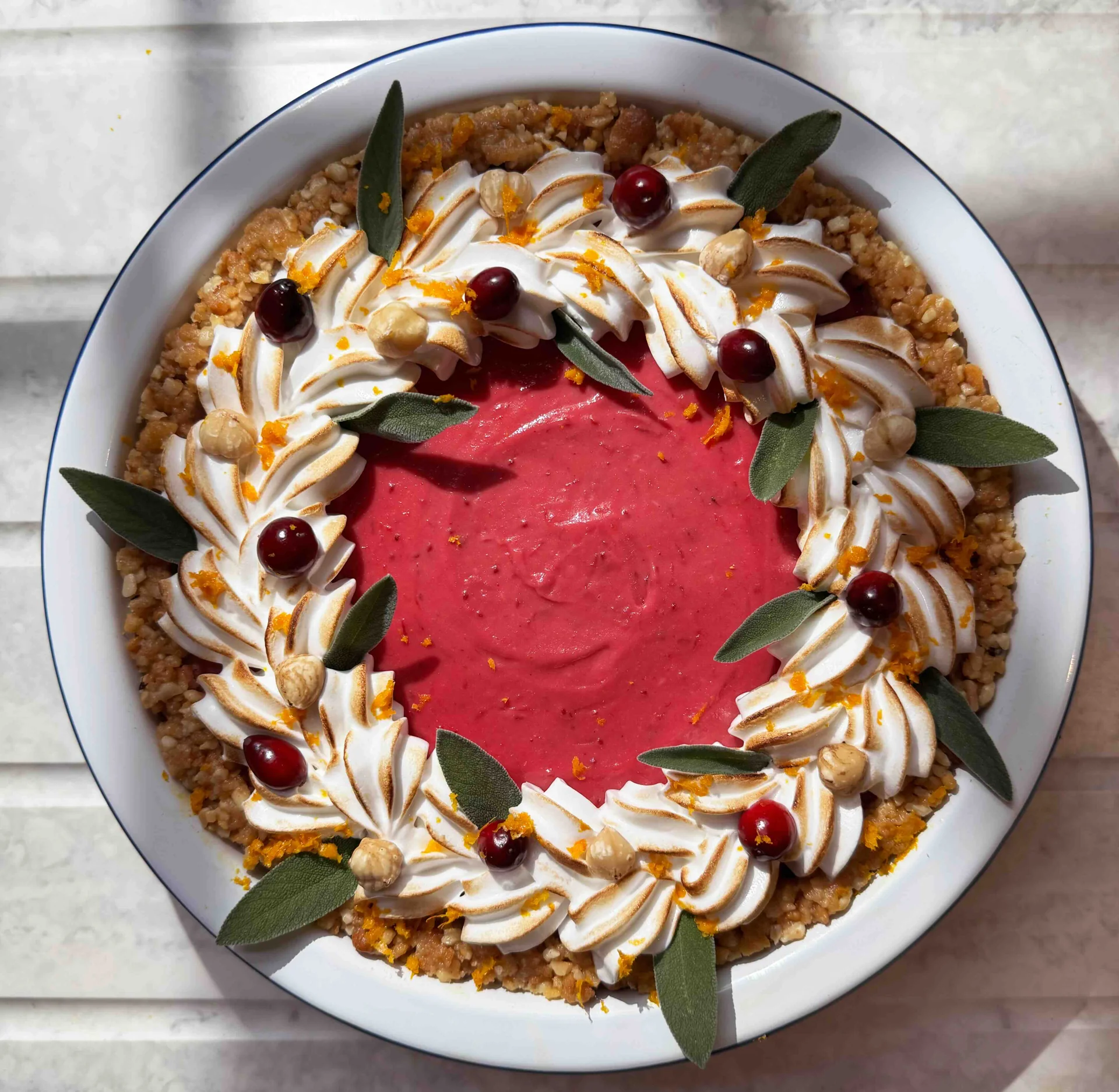 A hazelnut and buttery biscuit tart base filled with a silky cranberry and orange curd decorated with an toasted Italian meringue wreath. Practically a slice of Christmas joy!