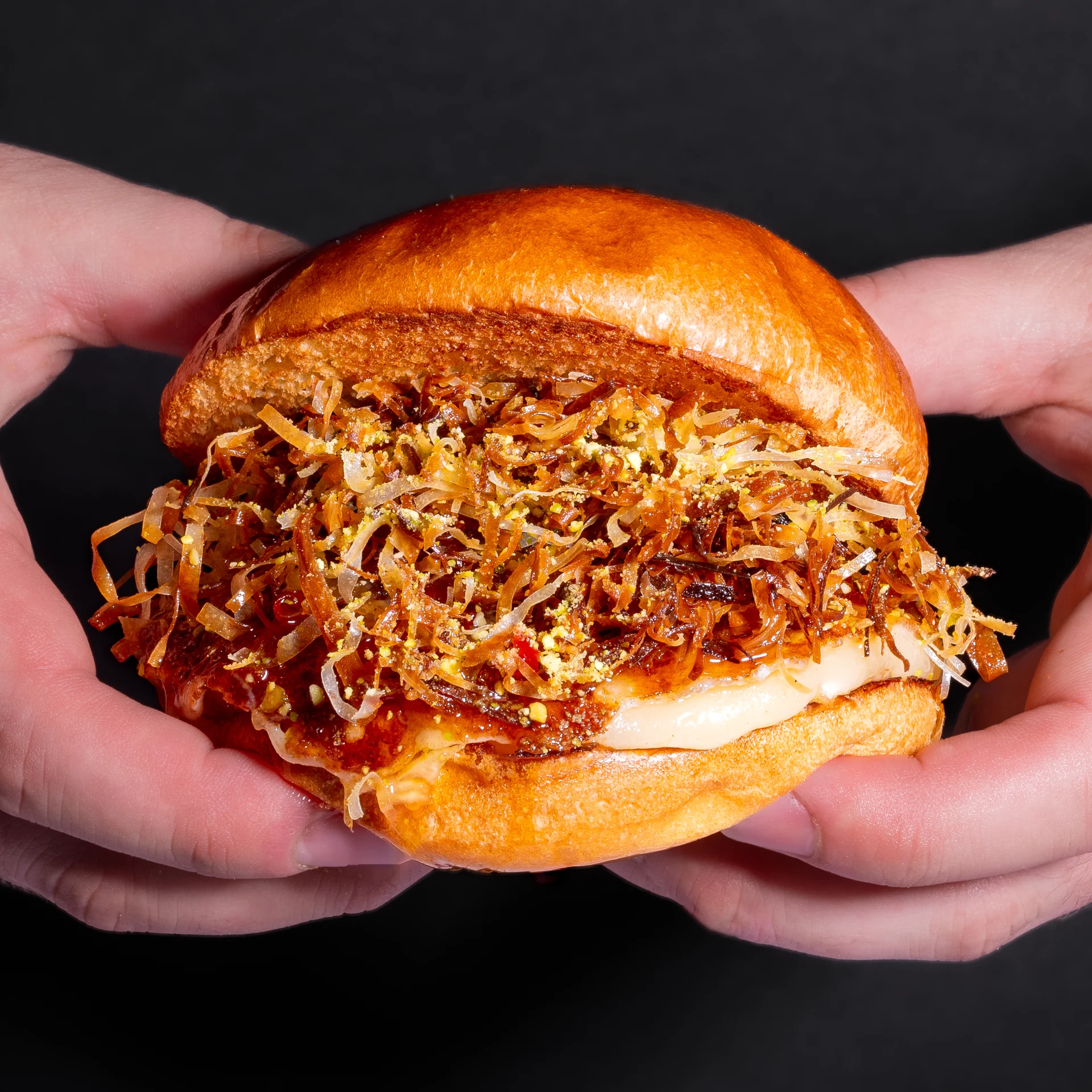 To assemble this beauty, add the cheese onto the bottom bun, cover with hot honey, a hefty amount of the crispy filo and even more pistachios. Close and enjoy!