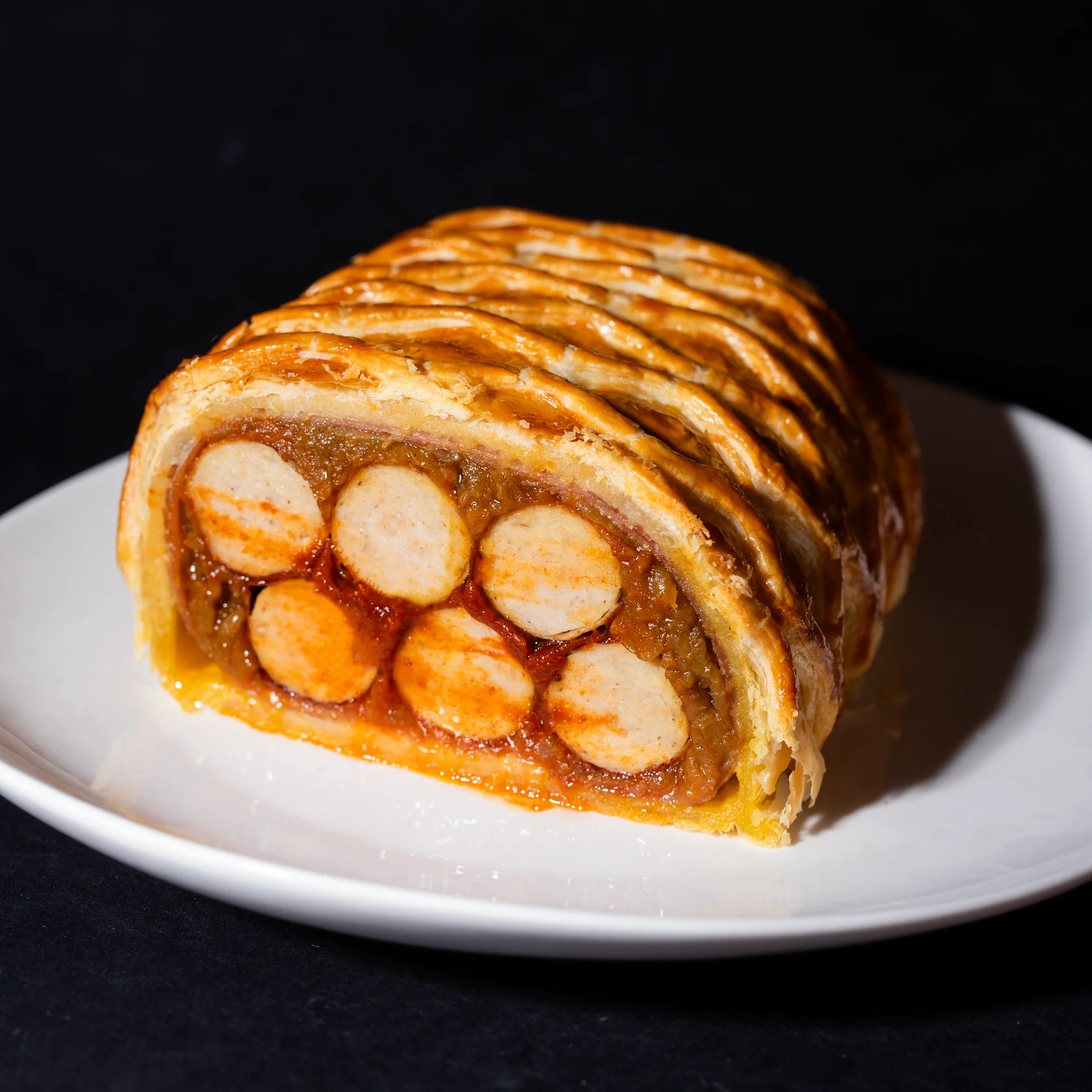 All hail the currywurst wellington. It's big, it's unashamed, it's living it's best life. It's a celebration of sausages, of curry ketchup, of all things good (and a bit silly) in the world.