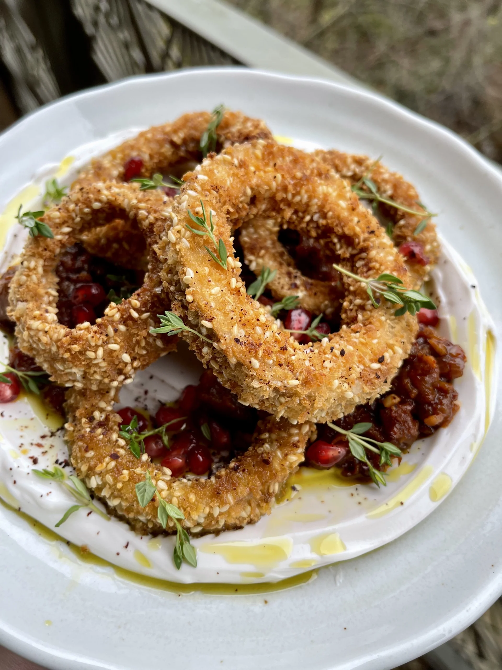 This no waste recipe uses the whole aubergine in 2 ways. Crispy sesame crusted rings of aubergine on yoghurt or hummus with a kind of sticky aubergine sauce made with fried with shallots, garlic, baharat and harissa.