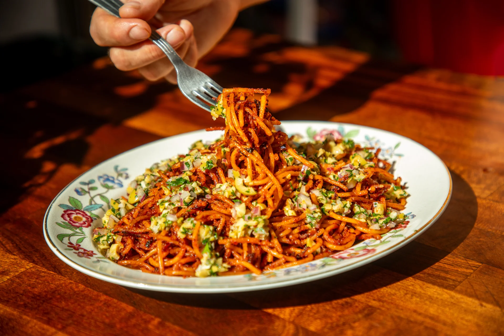 If you think you know a lot about pasta cooking, you'll need to rethink everything for Spaghetti Assassina. You cook it in one pan with little additions of liquid, like a risotto. You burn it, intentionally. The texture is unlike any other pasta - it's chewy, it's got crunchy little bits, it's spicy as hell. In short? You're going to love this one!