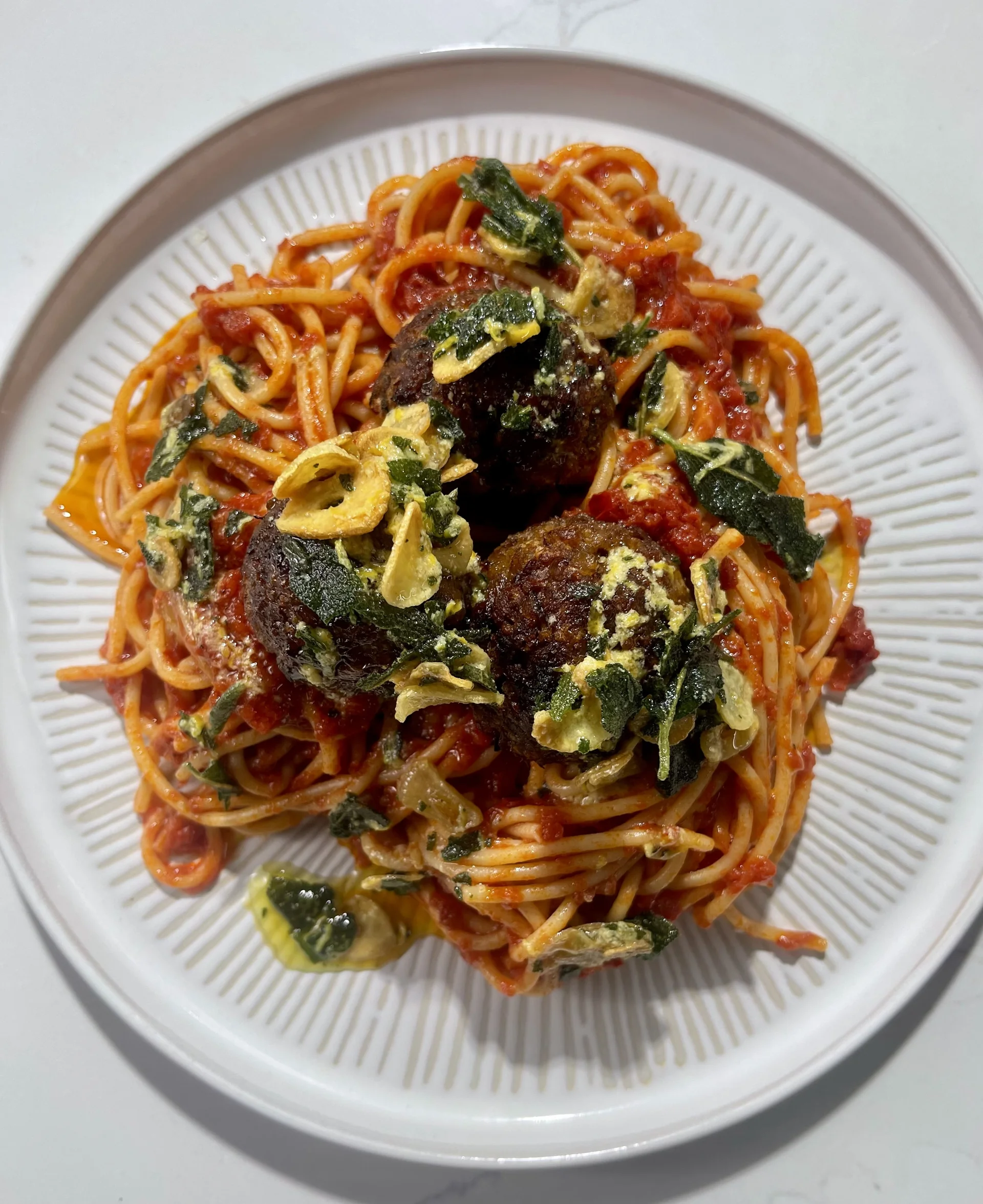 • Meanwhile, cook your spaghetti according to pack instructions. Once cooked, strain, reserve about 200ml pasta water, add the spaghetti to the pan and toss with the reserved water to get a silky sauce. Serve up by plating your spaghetti, topping with the balls and drizzling over the sage oil.