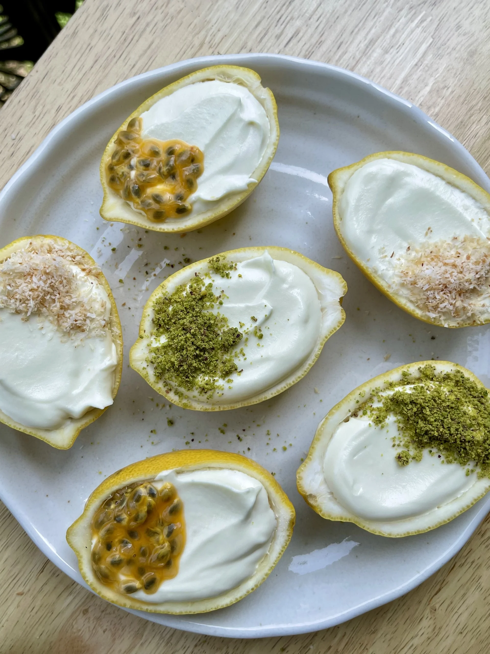 Add half the curd mixture (more if you want a more tart dessert) to the cream and stir through until fully combined. Place dollops into each lemon half and garnish with whichever toppings you fancy - a sprinkling of pistachios, coconut or a spoonful of passion fruit. Enjoy!