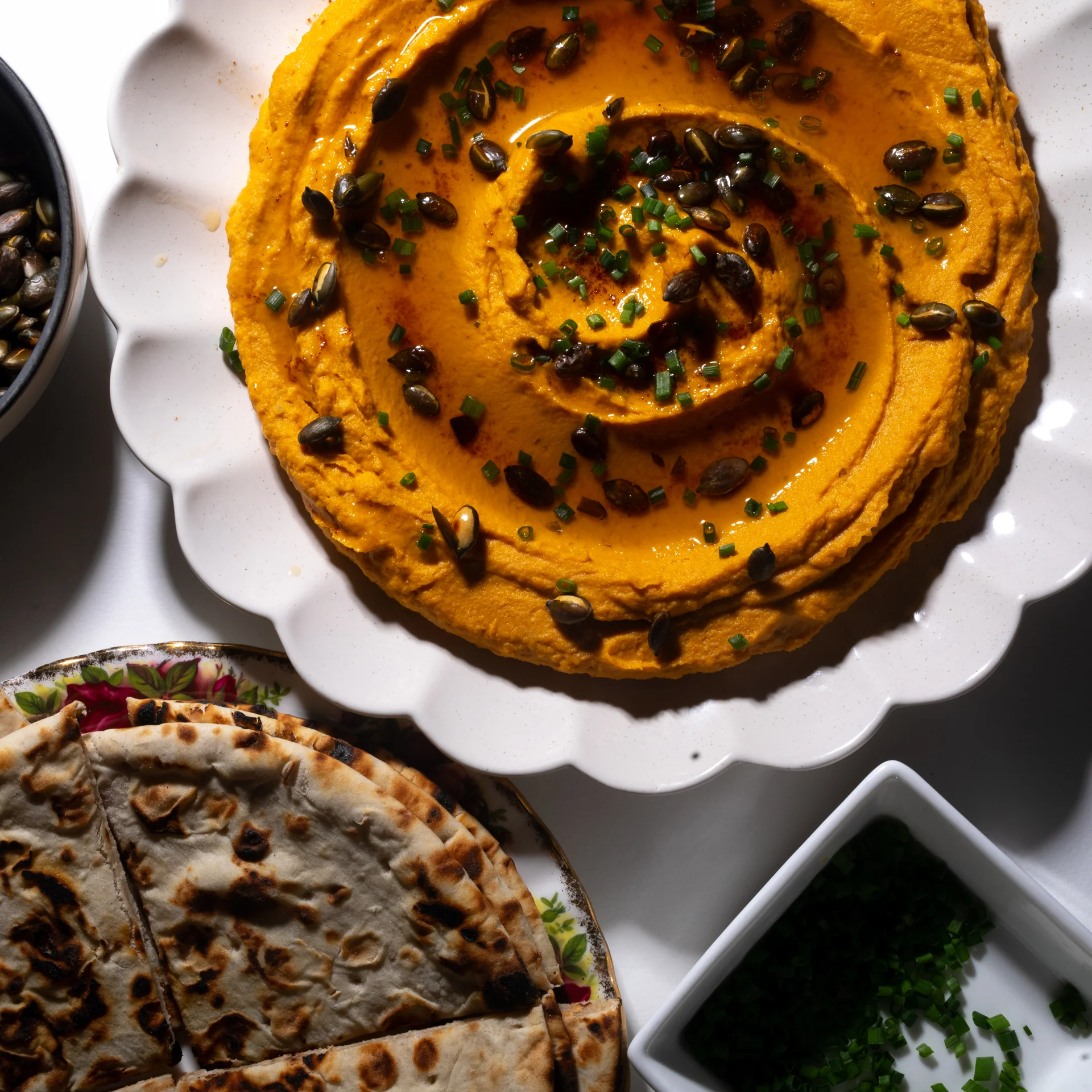 That’s right, it’s autumn. To celebrate the changing of the seasons with something warm and cosy, this plate of roasted pumpkin hummus with toasted pumpkin seeds and brown butter is just the thing.