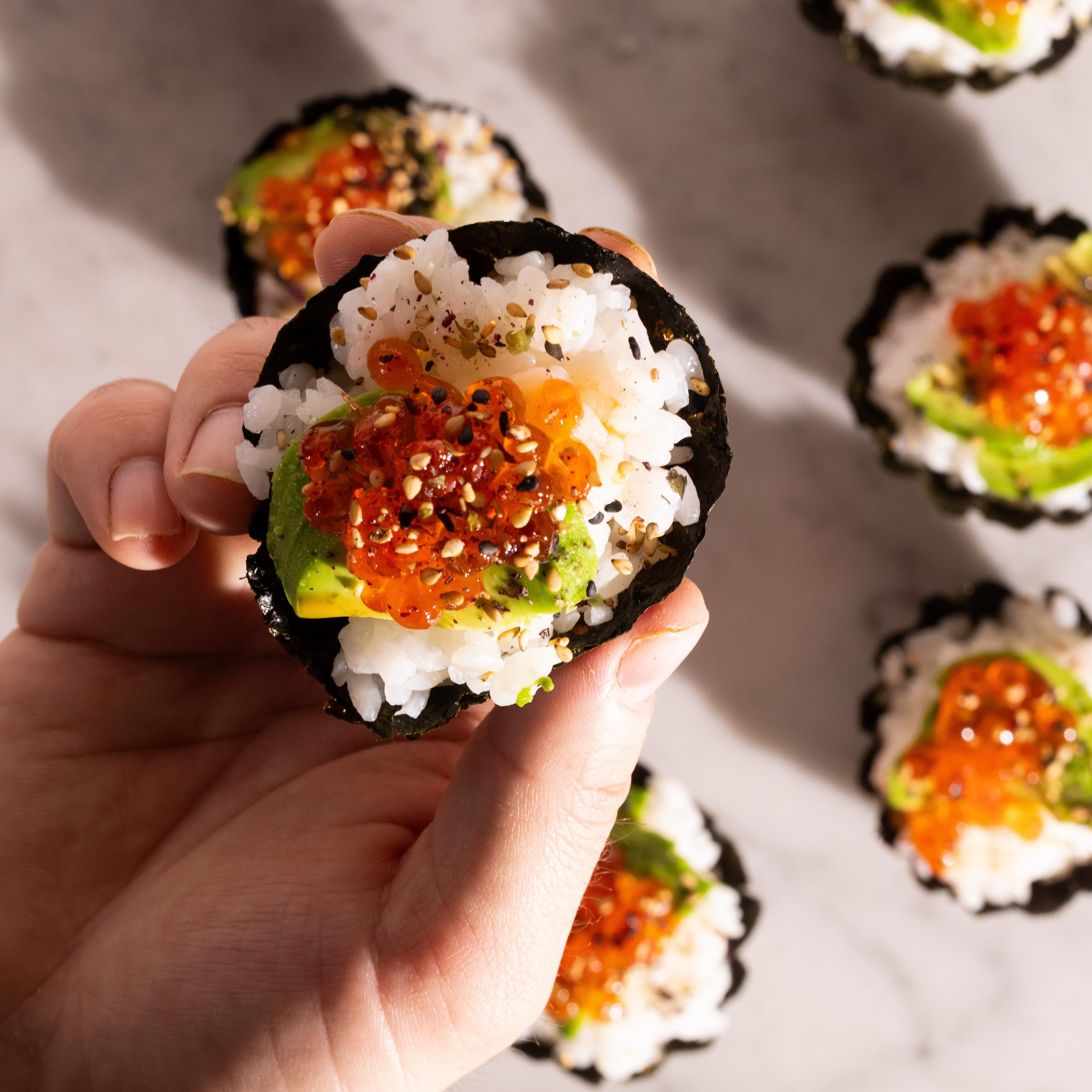 We came across this from @mattstication who came up with the idea of setting damp nori sheets between tart tins to make these adorable crisp little sushi cups. Once you've made them you can really stuff them with whatever you like. We've gone for sushi rice, avocado and and salmon roe then furikake seasoning but to be honest, go with whatever you fancy!