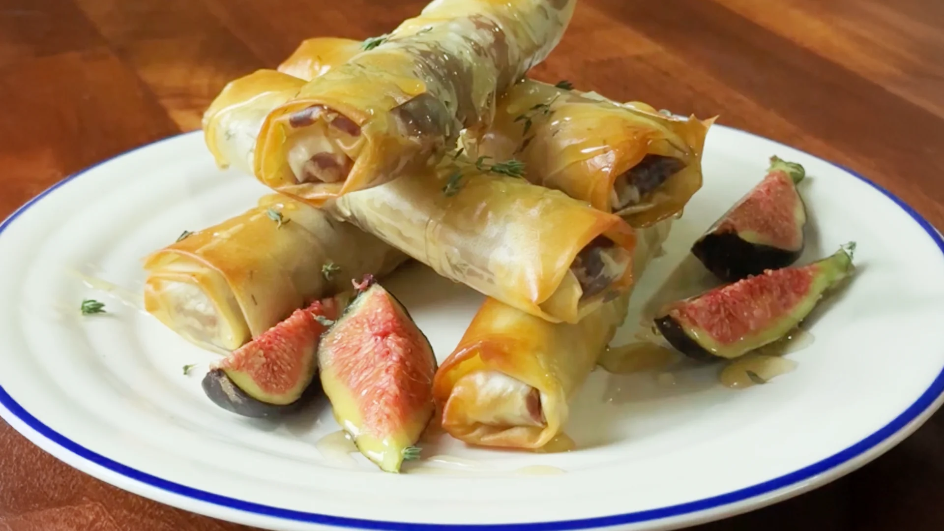 Made in Totnes in Devon, Ticklemore goat's cheese is known for its mild, lemony, and herbaceous flavour, and firm yet crumbly texture. Here, we've paired it with and sweet and jammy onions and figs, and encased it in crisp filo pastry.